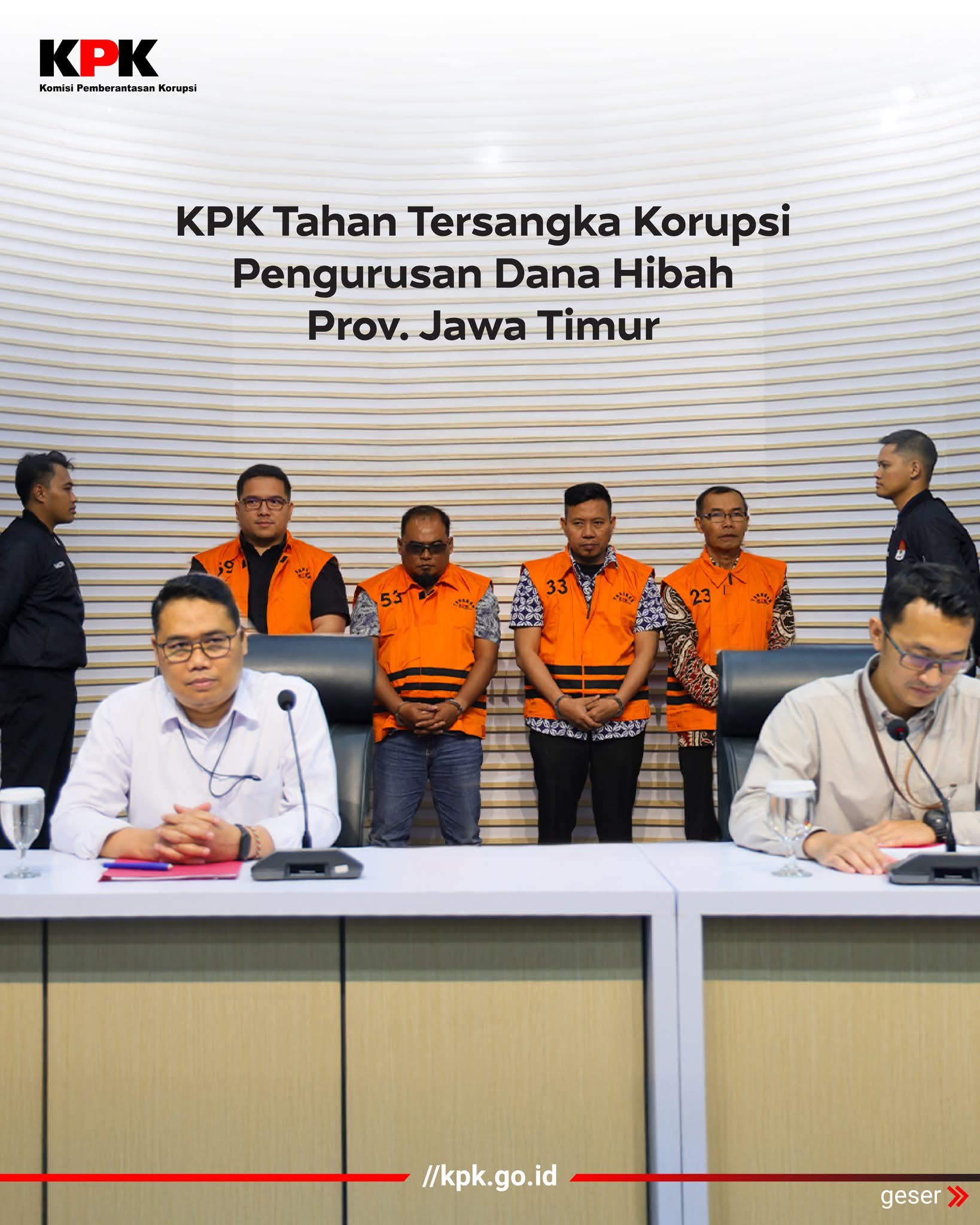 KPK menetapkan 21 orang sebagai tersangka korupsi, serta menahan 4 orang di antaranya, terkait pengurusan dana hibah dari Anggaran Pendapatan dan Belanja Daerah (APBD) Provinsi Jawa Timur untuk kelompok masyarakat di Jawa Timur TA 2019-2022.Kamis (2/10/2025).