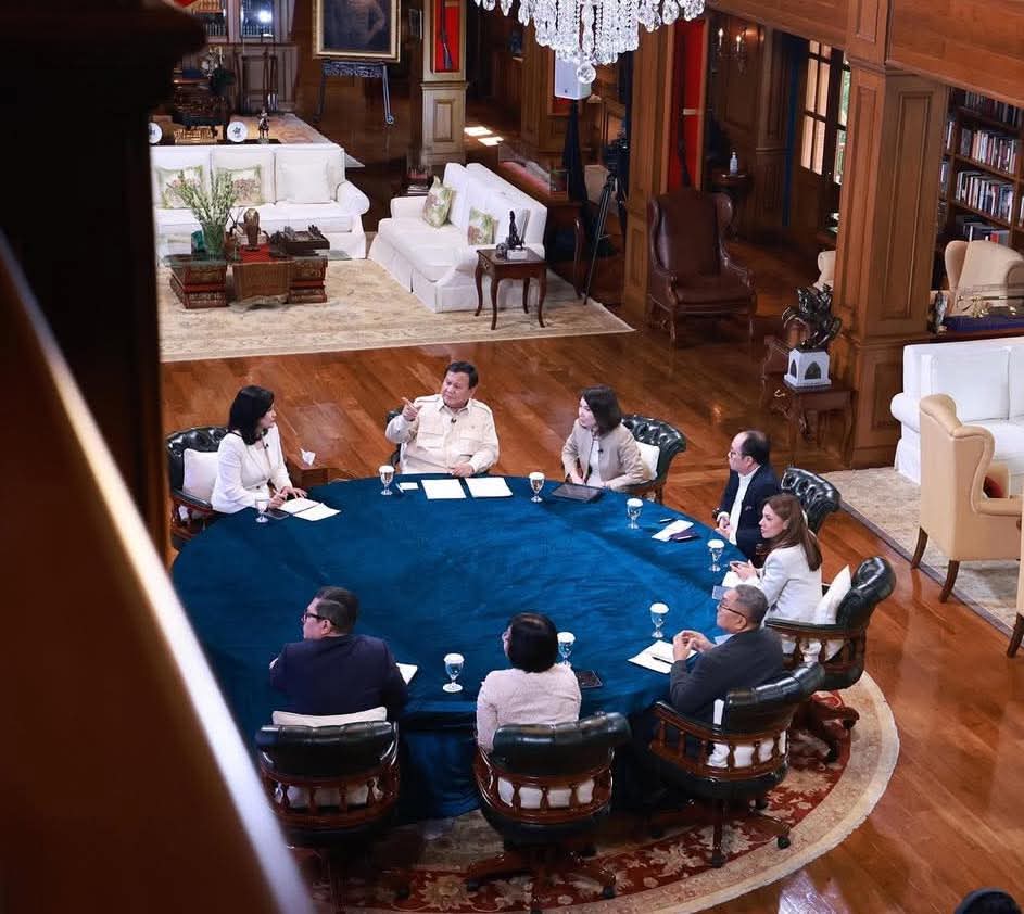 Dalam perbincangan yang berlangsung hampir 4 jam, Presiden Prabowo menerapkan 1 ground rules: Semua boleh bertanya apa saja on the record. Tidak ada pertanyaan yang disampaikan sebelumnya ke Presiden atau timnya.