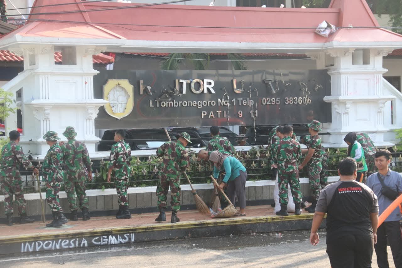 Pati|Mediacakranews.com – Tak hanya mengamankan jalannya aksi, para personel TNI Kodim 0718/Pati berjibaku bersama warga membersihkan sampah yang berserakan di lokasi pasca aksi unjuk rasa yang digelar di sekitar Alun-Alun Pati pada Kamis (14/8/2025).
