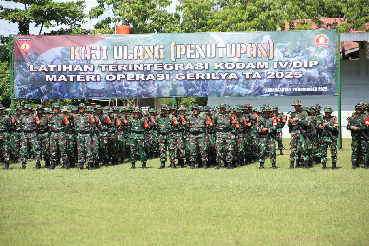 Karanganyar|Mediacakranews.com – Kodam IV/Diponegoro berhasil menyelesaikan seluruh tahapan Latihan Terintegrasi Operasi Gerilya yang digelar di Karanganyar kompleks, Latihan secara resmi ditutup pada Jumat (28/11/2025).