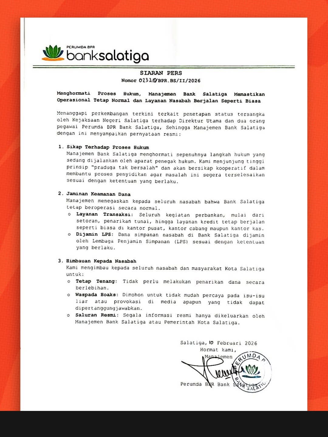 Menindaklanjuti Siaran Pers Bank Salatiga Nomor 0232.10/BPR.BS/II/2026, Pemerintah Kota Salatiga menyatakan menghormati sepenuhnya proses hukum yang sedang berjalan serta menjunjung tinggi asas praduga tak bersalah. Pemerintah juga mendukung sikap kooperatif manajemen Bank Salatiga dalam membantu aparat penegak hukum agar proses berjalan sesuai ketentuan.